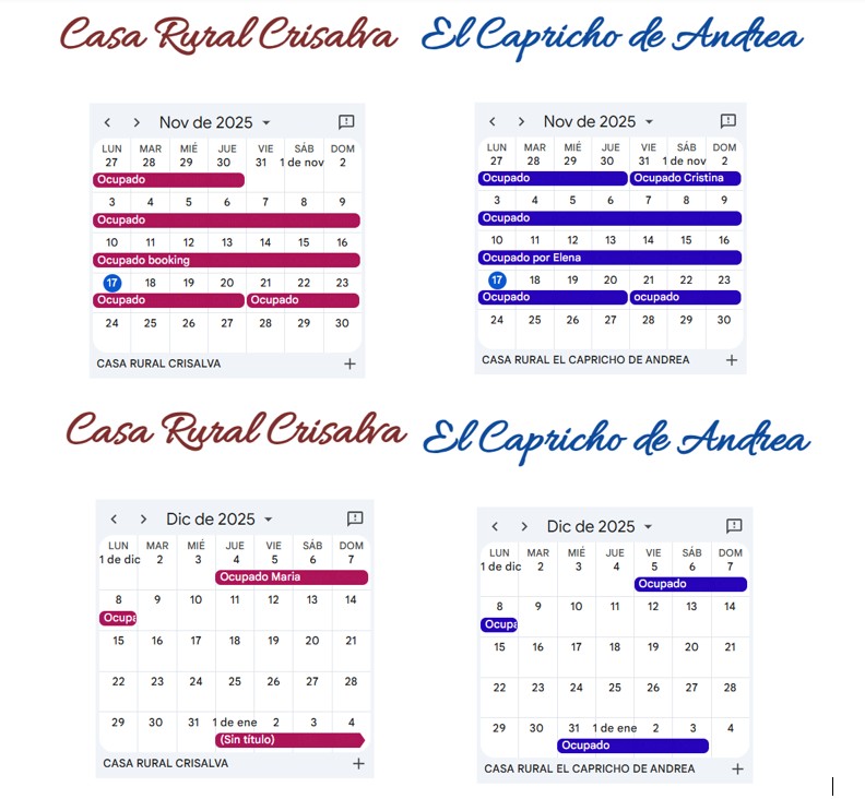 Nuestros calendarios de reservas muestran una ocupación creciente para finales de 2025 y comienzos de 2026. Muchos fines de semana y puentes están ya reservados, por lo que recomendamos planificar la estancia con antelación.